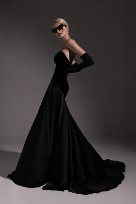 Confeccionado en crepé de seda rojo profundo, de brillo casi líquido, la creación de GOROF reinterpreta la elegancia de las divas de Hollywood de los años 30, traducida a un lenguaje contemporáneo y poderoso.